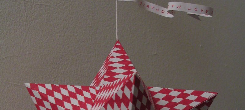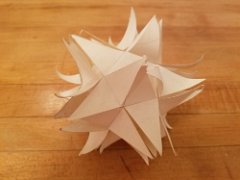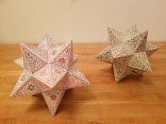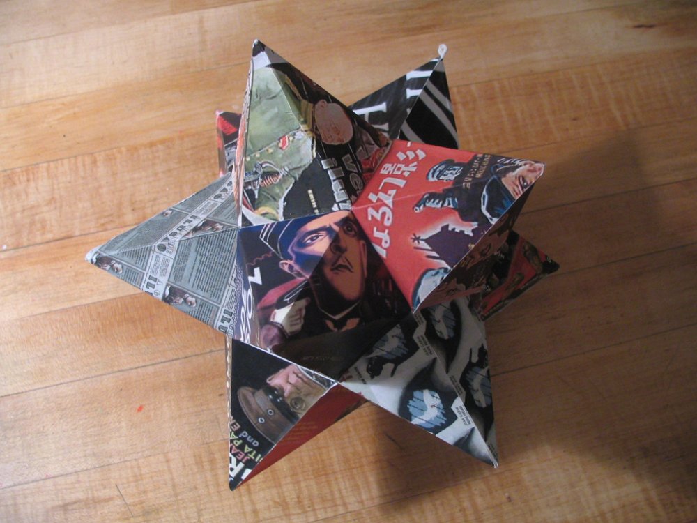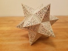 Small stellated dodecahedron made from slotted pentagrams without glue, steam damaged